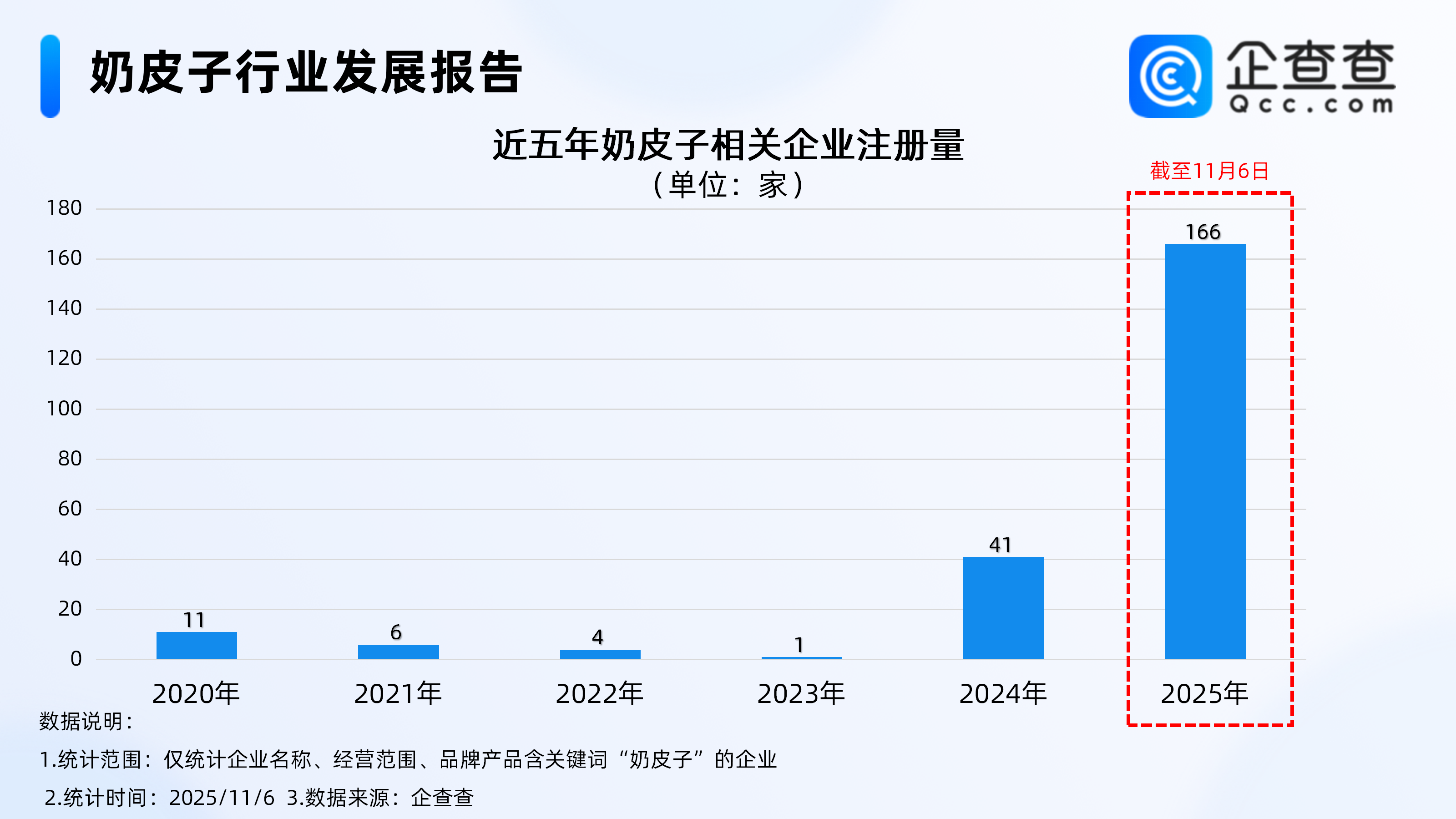 企查查数据显示,截至11月6日,国内奶皮子相关企业现存量达235家,超7成相关企业成立于1年内,占比达74.04%。其次为成立年限在5-10年的相关企业,占比达10.21%。2、今年奶皮子相关企业注册量暴涨