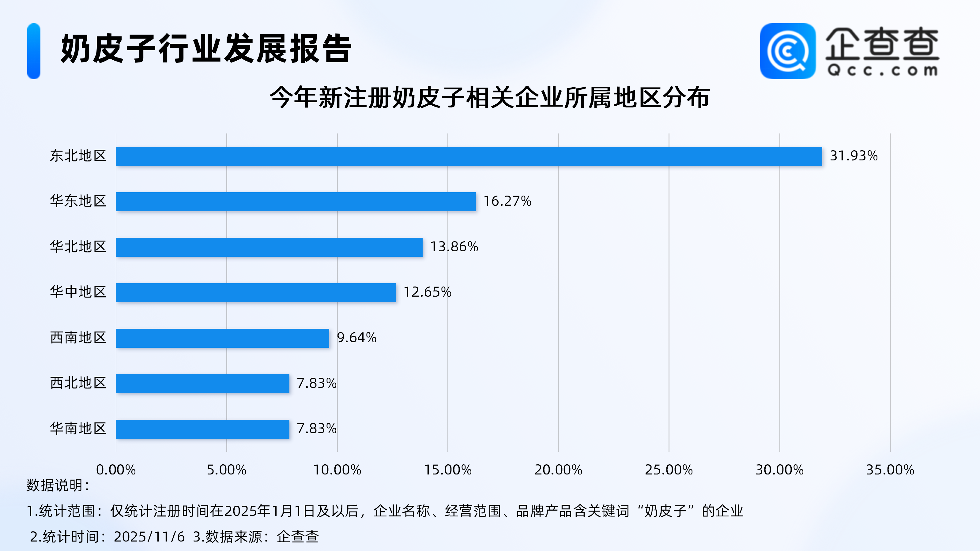 企查查数据显示,从地域分布来看,今年新注册的奶皮子相关企业,多分布在东北地区,占比达31.93%,其次为华东、华北地区,分别占比16.27%、13.86%。